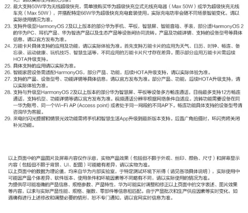 外包装采用塑封,彩盒内标配: 手机(内置电池) x 1 华为SuperCharge充电器 X 1 USB Type-C 数据线 X 1 超薄保护软壳 x 1 快速指南 x 1 取卡针 x 1 保护膜(出厂贴在手机上) X 1 三包凭证 x 1 会员权益礼包 x 1 *最终以实物为准。 |